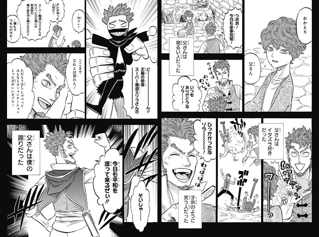 - พอเห็นแบบนี้ซาคก็นึกถึงเรื่องในอดีต... พ่อกลับมาแล้วโซระ คำทักทายที่พ่อพูดเมื่อกลับมาถึงบ้าน พ่อผู้เป็นอัศวินเวทของอาณาจักรโคลเวอร์ สดใสร่าเริง มองโลกในแง่ดีเสมอ และชอบแกล้งเขาอยู่เป็นประจำ